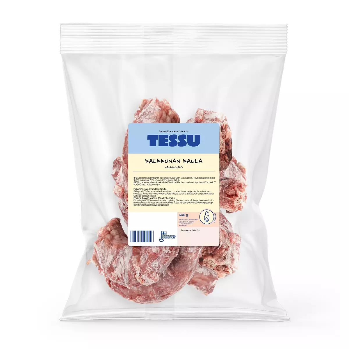 (FI) Koostumus: suomalainen kalkkunan kaula (Huom! Sisältää luuta.) Ravintosisältö: raakavalk. 16,0 %, raakarasva 7,3 %, kalsium 1,33 %, fosfori 0,78 %.
